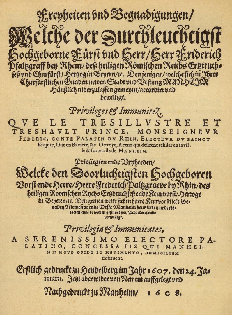 Titelblatt der Mannheimer Stadtprivilegien von 1607, Nachdruck von 1608, MARCHIVUM