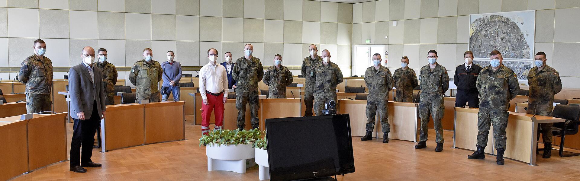 Seit dem 22. Oktober 2020 haben Soldaten der 1. Kompanie des Panzerbataillons 363 in Hardheim in Vollzeit an sieben Tagen in der Woche das Gesundheitsamt in Mannheim beim Einsatz gegen die Corona-Pandemie unterstützt. Jetzt übernimmt das ABC-Abwehrbataillon 750 aus Bruchsal diese Aufgabe. Im Ratssaal wurden heute (21.04.2021) die Soldaten aus Hardheim verabschiedet und „der Staffelstab“ wurde an die Soldaten aus Bruchsal übergeben.