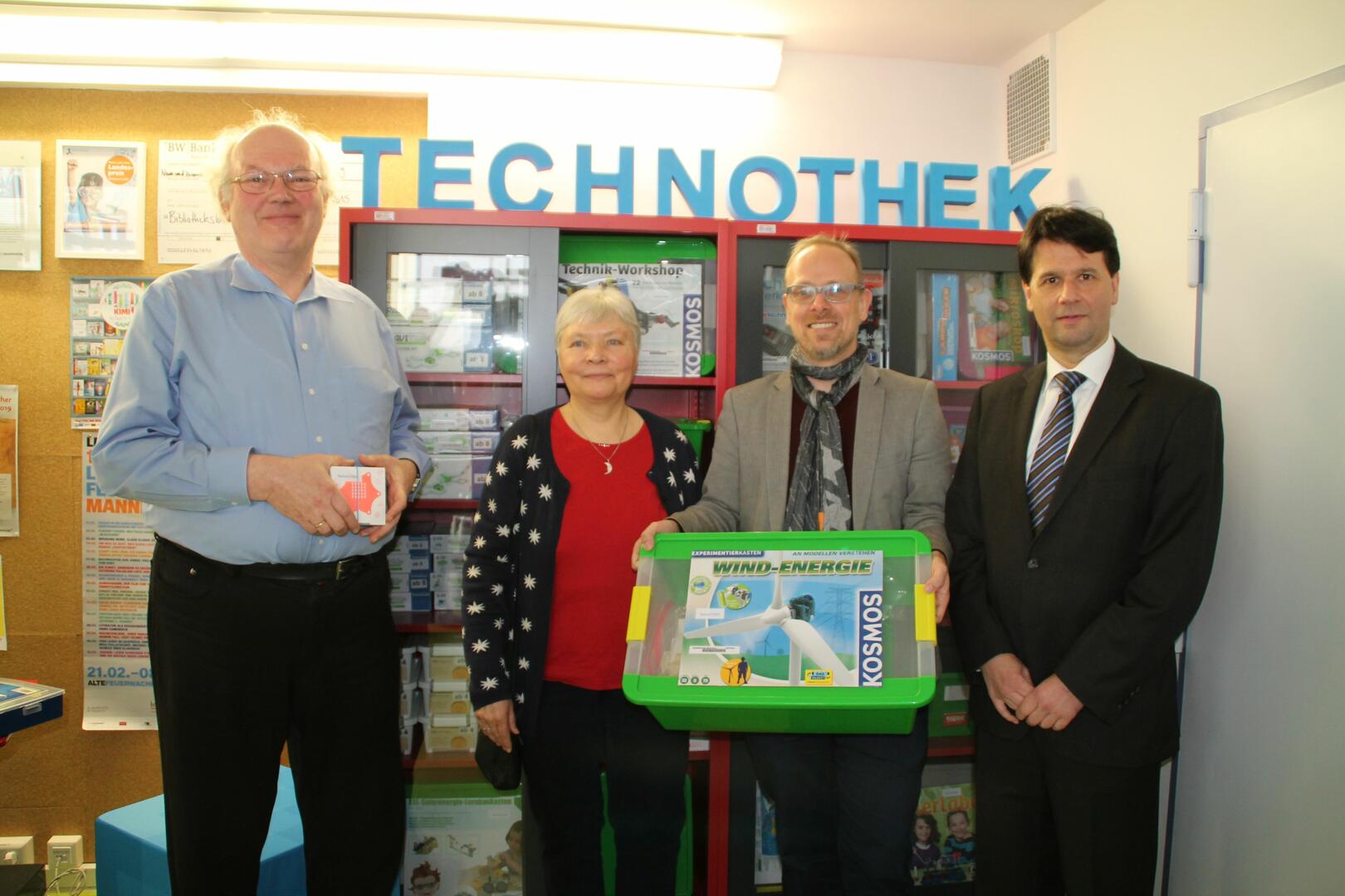 Die Kinder- und Jugendbibliothek der Stadtbibliothek freut sich über ihre neue TechnoTHEK. Bildungsbürgermeister Dirk Grunert (2.vl.r) dankte bei der Eröffnung den Sponsoren, Alexander Kling (rechts), für das Ressort Jugend und Technik verantwortliche Vorstandsmitglied des Vereins Deutscher Ingenieure (VDI), Regina Umland vom Vorstand des Fördervereins der Stadtbibliothek sowie Martin Zieglier, iT@school der Deutschen Telekom (links).