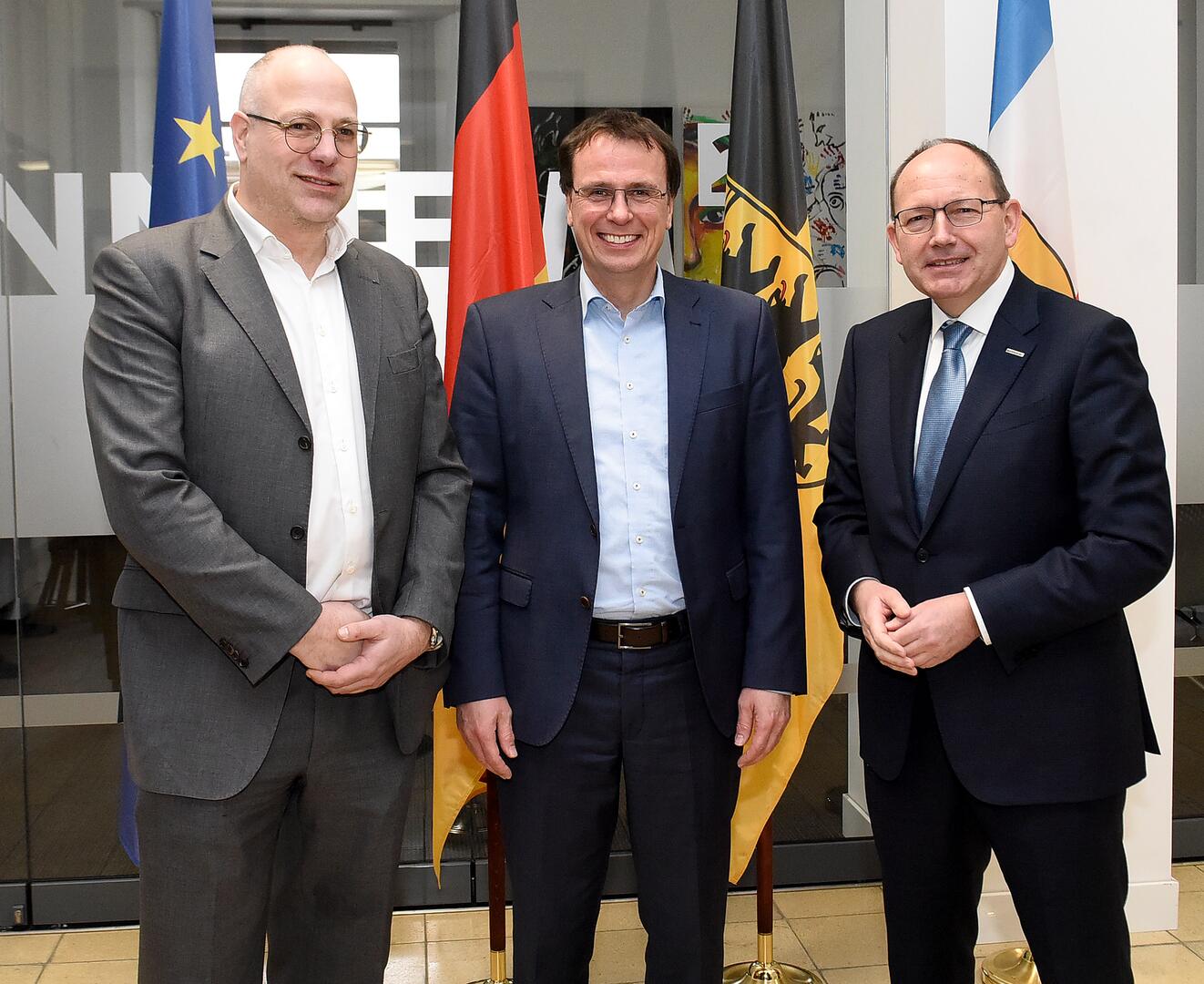 Folker R. Zöller, Honorarkonsul der Französischen Republik, Volker Schebesta, Staatssekretär im Ministerium für Kultus, Jugend und Sport und Christian Specht, Erster Bürgemeister und Vorsitzender des Institut Français Mannheim, bei der Übergabe der Landesförderung.