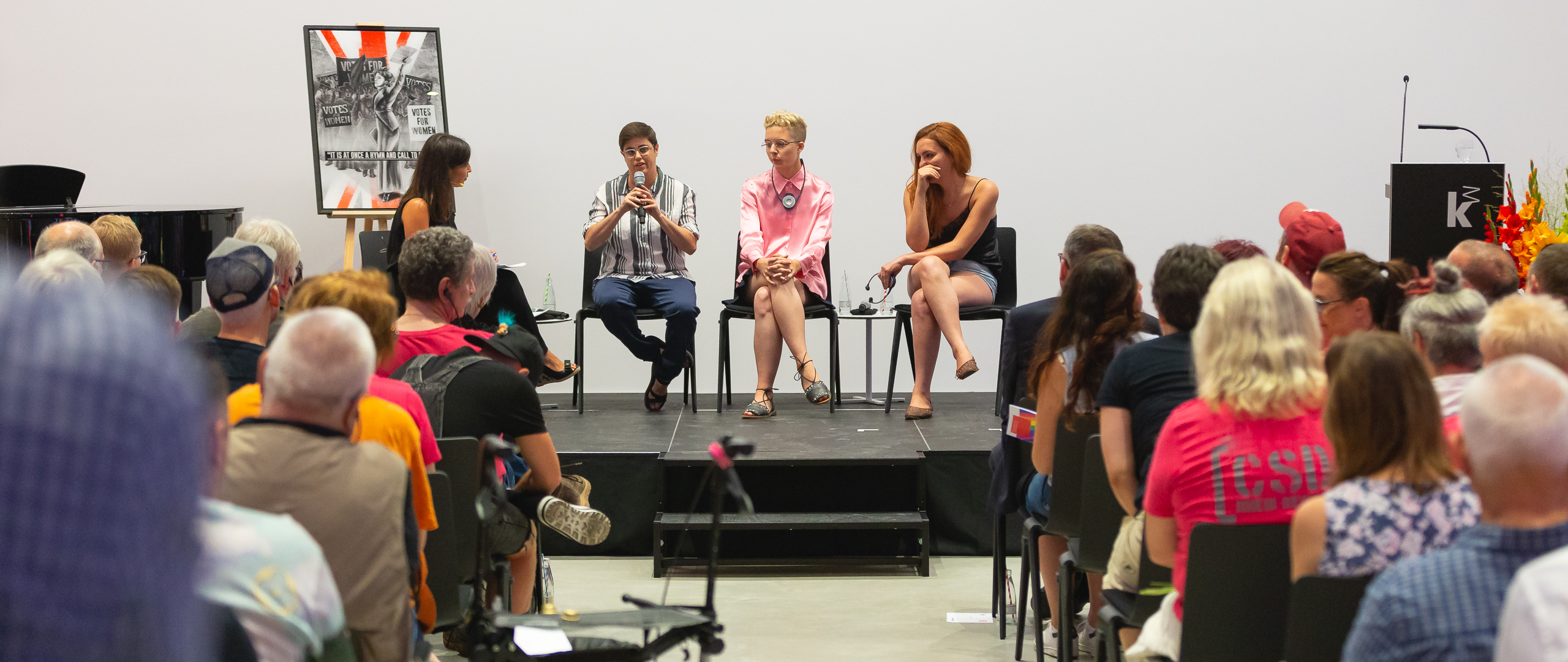 Moderatorin Rosa Omeñaca Prado und die Aktivistinnen Stephanie Kuhnen aus Berlin Charlottenburg-Wilmersdorf, Sida Olesiak aus dem polnischen Bydgoszcz, Oksy Morar aus dem litauischen Klaipėda sowie Alys Einion aus dem walisischen Swansea (v. l.) bei einer Talkrunde