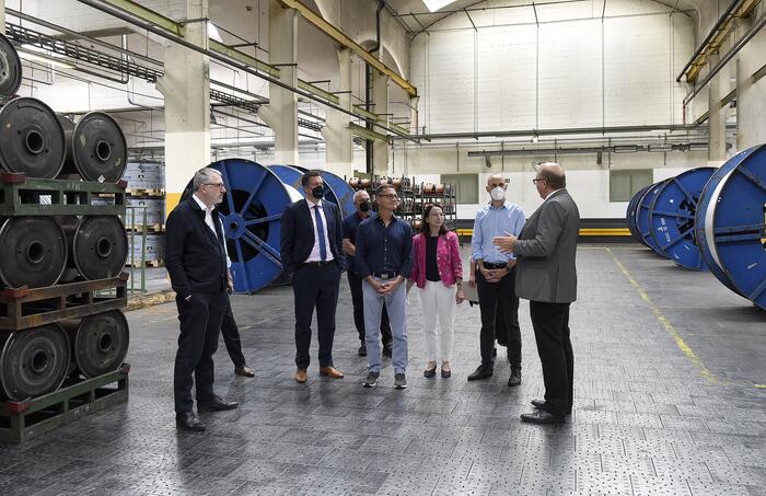 v.l.n.r. Petar Drakul (Referent des Oberbürgermeisters), Bürgermeister Ralf Eisenhauer, Dr. Johannes Kaumanns (Standortleiter Südkabel), Oberbürgermeister Dr. Peter Kurz, Sebastian Ebert (Vertriebsleiter Südkabel), Christiane Ram (Leiterin des Fachbereichs für Wirtschafts- und Strukturförderung), Dr. Elmar Bourdon (stellvertretender Leiter des Fachbereichs für Wirtschafts- und Strukturförderung), Wolfram Riegler (Betriebsratsvorsitzender Südkabel)