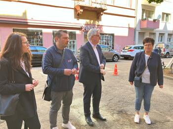 V.l.n.r. Bezirksbürgerserviceleiterin Olita Steger, Manuel Wamser, Leiter der DRK-Einrichtungen Tafel und Second Hand, Bürgermeister Thorsten Riehle und Christiane Hammoudi, Geschäftsführerin DRK Kreisverband Mannheim e.V., vor der Tafel in der Alphornstraße.