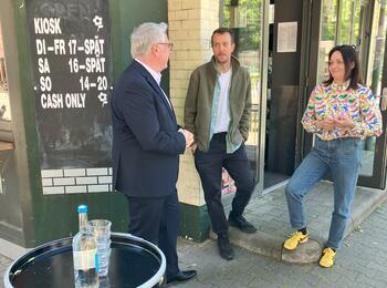 V.l.n.r. Daniel Gold, Geschäftsführer "Goldladen", Jennifer Pohl, Quartiermanagerin Neckarstadt-West, Thorsten Riehle, Bürgermeister für Wirtschaft, Arbeit, Soziales und Kultur, sowie Conni Kern, Geschäftsführerin "Conni Kern Interior", im gemeinsamen Geschäft.