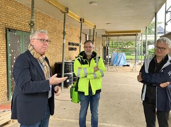 Bürgermeister Thorsten Riehle besuchte unter anderem die Baustelle in der Kirche St. Hildegard, dem künftigen Bildungszentrum für Pflege- und Sozialberufe. Arnulf Hellerschmidt (mittig) und Andreas Kaupp (rechts) vom Architekturbüro Kaupp und Franck führten durch die Baustelle.