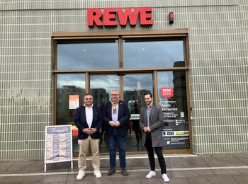Auf dem Stadtteiltag Käfertal wurde auch das neue Quartier Spinelli besucht. V.l.n.r. im Bild: Sahin Karaaslan, Inhaber des seit wenigen Wochen eröffneten Rewe Marks in Spinelli, Thorsten Riehle, Wirtschaftsbürgermeister der Stadt Mannheim, und Florian Mattheier, Bürgerserviceleiter Käfertal.