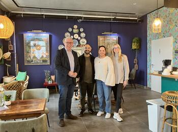 Der Stadtteiltag Käfertal führte Bürgermeister Riehle auch ins Café Bazaar in Spinelli. Die Inhaber Emre Naeem und Sabera Maqsudi (zweite und dritte Person von links) führen das auf der gleichen Straße gelegene Restaurant Granatapfel.