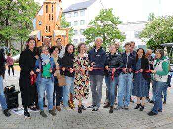 Gemeinsam mit Vertretern der Bürgerinitiative "Kopernikusspielplatz", Stadt- und Bezirksbeiräten sowie Mitarbeitern des Stadtraumservice eröffnet die Erste Bürgermeisterin Prof. Dr. Diana Pretzell den neu gestalteten Spielplatz.