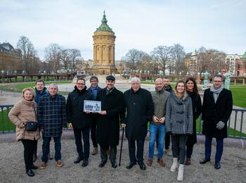 Freuen sich über eine Förderung in Höhe von 80.000 Euro von der Deutschen Stiftung Dekmalschutz an die Stadt Mannheim (von link): Georg Wacker (Geschäftsführer der Toto-Lotto Baden-Württemberg GmbH), Birgit Schubert-Hilbert, Dr. Georg Hilbert (Geschäftsführer der gh-DenkMalPlan GmbH), Helen Heberer (Ortskuratorin Mannheim der Deutschen Stiftung Denkmalschutz), Jochen Baumann (Projektleiter MVV Netze GmbH), Ralf Eisenhauer (Baubürgermeister Stadt Mannheim), Gordon Pickford (Geschäftsführung der MVV Netze GmbH) und Thomas Mäder (Fachbereich Bau- und Immobilienmanagement).