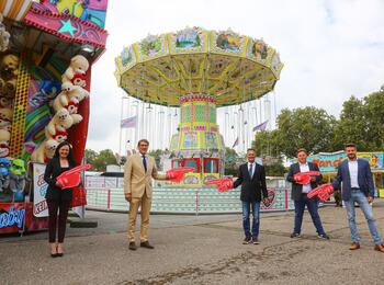 Freuen sich auf die Fun & Food 2021 (v.l.): Christine Igel, Geschäftsführerin Event & Promotion Mannheim (EPM) GmbH, Bürgermeister Michael Grötsch, Aufsichtsratsvorsitzender EPM GmbH, Stephan Schuster, Erster Vorsitzender des Mannheimer Schaustellerverbandes, Manuel Reif, Zweiter Vorsitzender des Mannheimer Schaustellerverbandes, sowie Patrick Müller, Operativer Leiter Fun & Food bei der EPM GmbH.