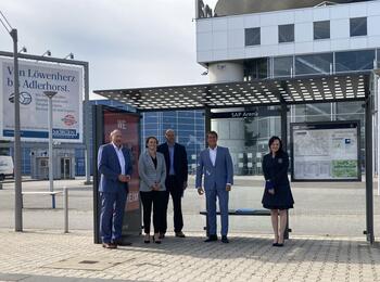 Stellten den neuen Fahrgastunterstand an der SAP-Arena vor (v.l.): Erster Bürgermeister Christian Specht, Aufsichtsratsvorsitzender MV Mannheimer Verkehr GmbH und Rhein-Neckar-Verkehr GmbH, Frauke Bank, Wall GmbH, Marcus Geithe, Geschäftsführer MV Mannheimer Verkehr GmbH, Bürgermeister Michael Grötsch, Aufsichtsratsvorsitzender der Event & Promotion Mannheim GmbH, und Christine Igel, Geschäftsführerin der Event & Promotion Mannheim GmbH.