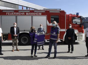 Mannheims Erster Bürgermeister und Feuerwehrdezernent Christian Specht überreicht den Fahrzeugschlüssel gemeinsam mit dem stellvertretenden Feuerwehrkommandanten Thomas Näther an den stellvertretenden Adenauer Wehrführer René Lenzen.
