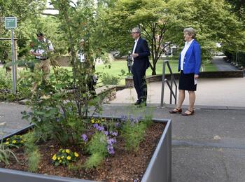 Oberbürgermeister Dr. Peter Kurz und Bürgermeisterin Felicitas Kubala stellen die Aufwertungen in den Innenstadtgärten vor.