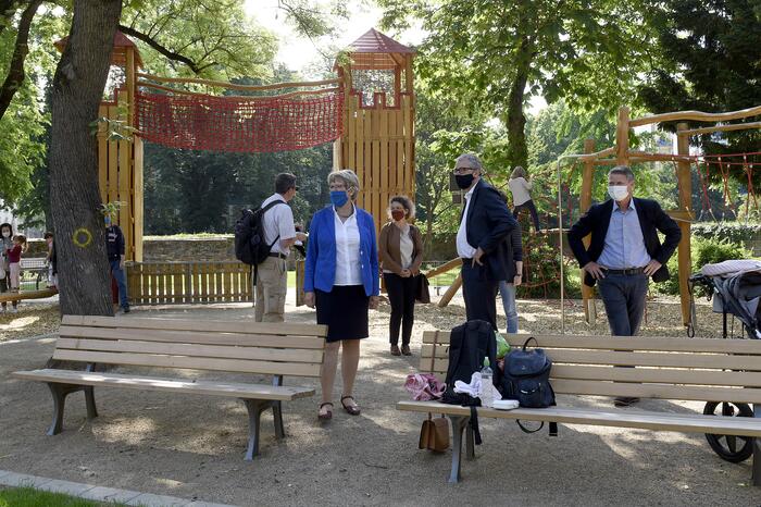 Die Stadtspitze begutachtet den neu gestalteten Spielplatz in den Lauerschen Gärten