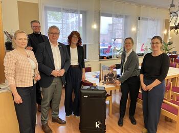Die Organisatoren des Museumskoffers der Kunsthalle für die Senioren- und Generationentreffs in Mannheim: v.l.n.r. Judith Schöler (Fachbereich Arbeit und Soziales), Dr. Jens Hildebrandt (Fachbereichsleiter Arbeit und Soziales), Sozial- und Kulturbürgermeister Thorsten Riehle, Jutta Breitner (Fachbereich Arbeit und Soziales) sowie Anna Quintus und Eva-Maria Winter von der Kunstvermittlung der Kunsthalle Mannheim.