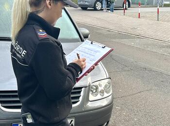 Eine Mitarbeiterin des Ordnungsdienstes bei einer Kontrolle an der Vogelstang-Grundschule. Das Halten - nicht nur das Parken - in einer Feuerwehrzufahrt ist nicht erlaubt.