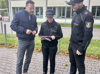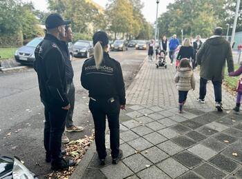 Bürgermeister und Sicherheitsdezernent Dr. Volker Proffen begleitet eine Kontrolle des Ordnungsdienstes an der Vogelstang-Grundschule.