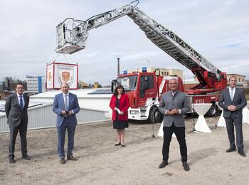 Begingen gemeinsam den bundesweiten Warntag (von links): Christoph Unger (Präsident des BBK), Christian Specht (Erster Bürgermeister und Sicherheitsdezernent der Stadt Mannheim), Jutta Steinruck (Oberbürgermeisterin der Stadt Ludwigshafen), Thomas Strobl (stellvertretender Ministerpräsidenten und Innenminister von Baden-Württemberg) sowie Randolf Stich (Staatssekretär im Innenministerium Rheinland-Pfalz).
