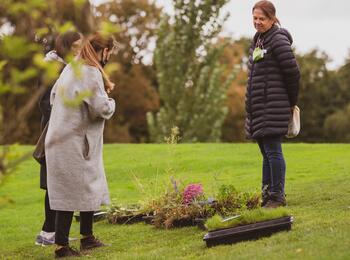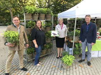 Bürgermeisterin Felicitas Kubala (r.) übergibt Claudia Schulz den Hauptpreis des diesjährigen Blumenschmuckwettbewerbs. Ebenfalls zu sehen: Bernd Otto (l.), Vorsitzender des Kreisgartenbauverbandes und Markus Roeingh, Leiter Eigenbetrieb Stadtraumservice.