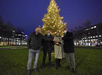 In der dunklen Morgenstunde übergibt ein Nikolaus einem Radfahrer:in ein kleines Geschenk.