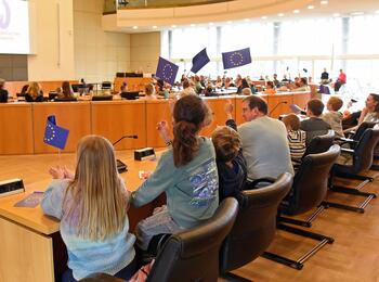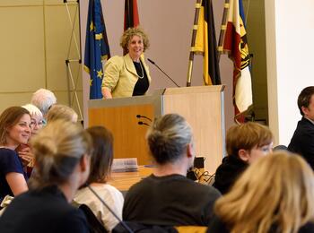 Erste Bürgermeisterin Prof. Dr. Diana Pretzell und Eigenbetriebsleiter Alexander Mauritz (hinten, 3. von links) mit den anwesenden Mitarbeitern der Stadtentwässerung, die für ihren Einsatz während der Flut im Ahrtal 2021 geehrt wurden