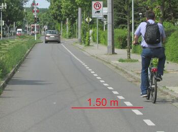Innerorts ist ein Abstand zu Radfahrenden von 1,50 Metern einzuhalten. In der Rheingoldstraße wurder Schutzstreifen daher mittlerweile demarkiert, da dieser eine Sicherheit suggierte, die so nicht vorhanden war.