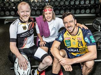 Die „Gesichter der Spiele“ freuen sich auf das Sportfest für Menschen mit geistiger Behinderung 2022 in Mannheim (von rechts): Rhein-Neckar Löwe Patrick Groetzki, die SOBW-Athleten Jennifer Kurz (Schwimmen) und Michael Lofink (Radfahren).