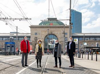Geschäftsführer Mannheimer Verkehr GmbH Marcus Geithe, Bürgermeisterin Prof. Dr. Diana Pretzell, Erster Bürgermeister Christian Specht und Geschäftsführer rnv Christian Volz.