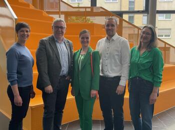 Eva-Maria Markutzik (Zentrumsleiterin MAFINEX), Wirtschaftsbürgermeister Thorsten Riehle, Helena Most (resourcly), Ian Draxten (resourcly), Sonja Wilkens (Mannheimer Wirtschaftsförderung)