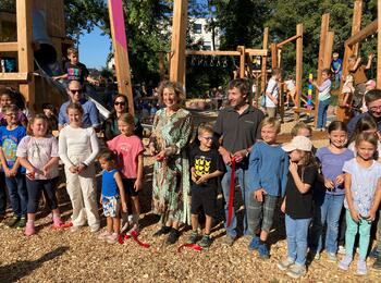 Erste Bürgermeisterin Prof. Dr. Diana Pretzell eröffnet mit weiteren Beteiligten den Spielplatz in der Rappoltsweiler Straße in Friedrichsfeld