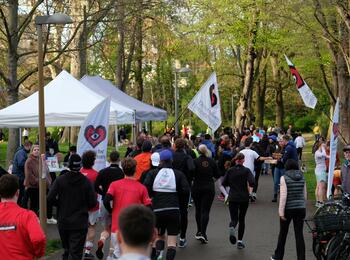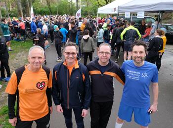 Die Initiatoren des Benefiz-Laufs Martin Vestweber, Geschäftsführer der Deutschen Herzstiftung (von links), Sportbürgermeister Ralf Eisenhauer, und Prof. Dr. Christoph Maack, DGK-Tagungspräsident (ganz rechts), mit Kollege Dr. Alexander Nickel vom Uniklinikum Würzburg.