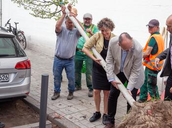 Voller Einsatz von Oberbürgermeister Christian Specht und Erster Bürgermeisterin Prof. Dr. Diana Pretzell bei der Pflanzung eines BUGA-Baumes in der Neckarstadt-West