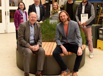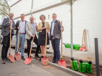 BUGA-Geschäftsführer Michael Schnellbach, Eigenbetriebsleiter Stadtraumservice Markus Roeingh, Oberbürgermeister Christian Specht, Erste Bürgermeisterin Prof. Dr. Diana Pretzell und Projektleiter Maximilian Brinker freuen sich über den neugepflanzten BUGA-Baum in der Neckarstadt-West.