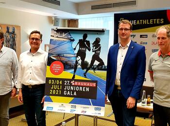 Freuen sich gemeinsam auf die 27. Juniorengala (von links): MTG-Organisator Rüdiger Harksen, Sportbürgermeister Ralf Eisenhauer, Manuel Löhmann vom Hauptsponsor Bauhaus und DLV-Chef-Bundestrainer Dietmar Chounard.
