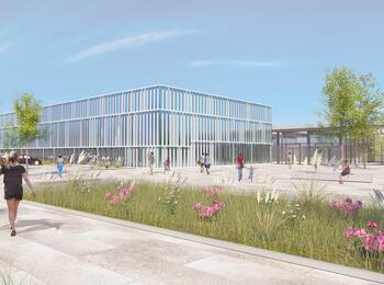 Spatenstich für die Freisportanlagen an der IGMH: Den ersten Spatenstich für die Sanierung setzen die BBS-Geschäftsführer Peter Doberass, Bildungsbürgermeister Dirk Grunert, Schulleiter Rainer Bade, Baubürgermeister Ralf Eisenhauer sowie BBS-Geschäftsführer Karl-Heinz-Frings (von rechts).