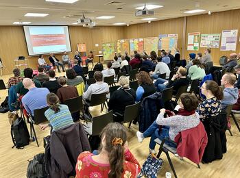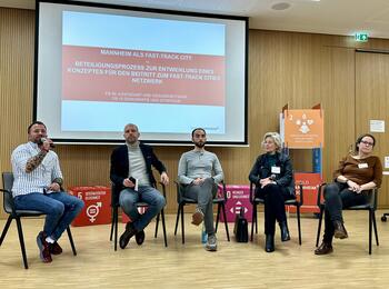 Podiumsdiskussion der Fraktionsmitglieder aus dem Gemeinderat von links: Max Appenroth (Moderation), Thomas Hornung (CDU), Dennis Ulas (LI.PAR.Tie), Prof. Dr. Heidrun Kämper (SPD), Dr. Regina Jutz (Grüne)