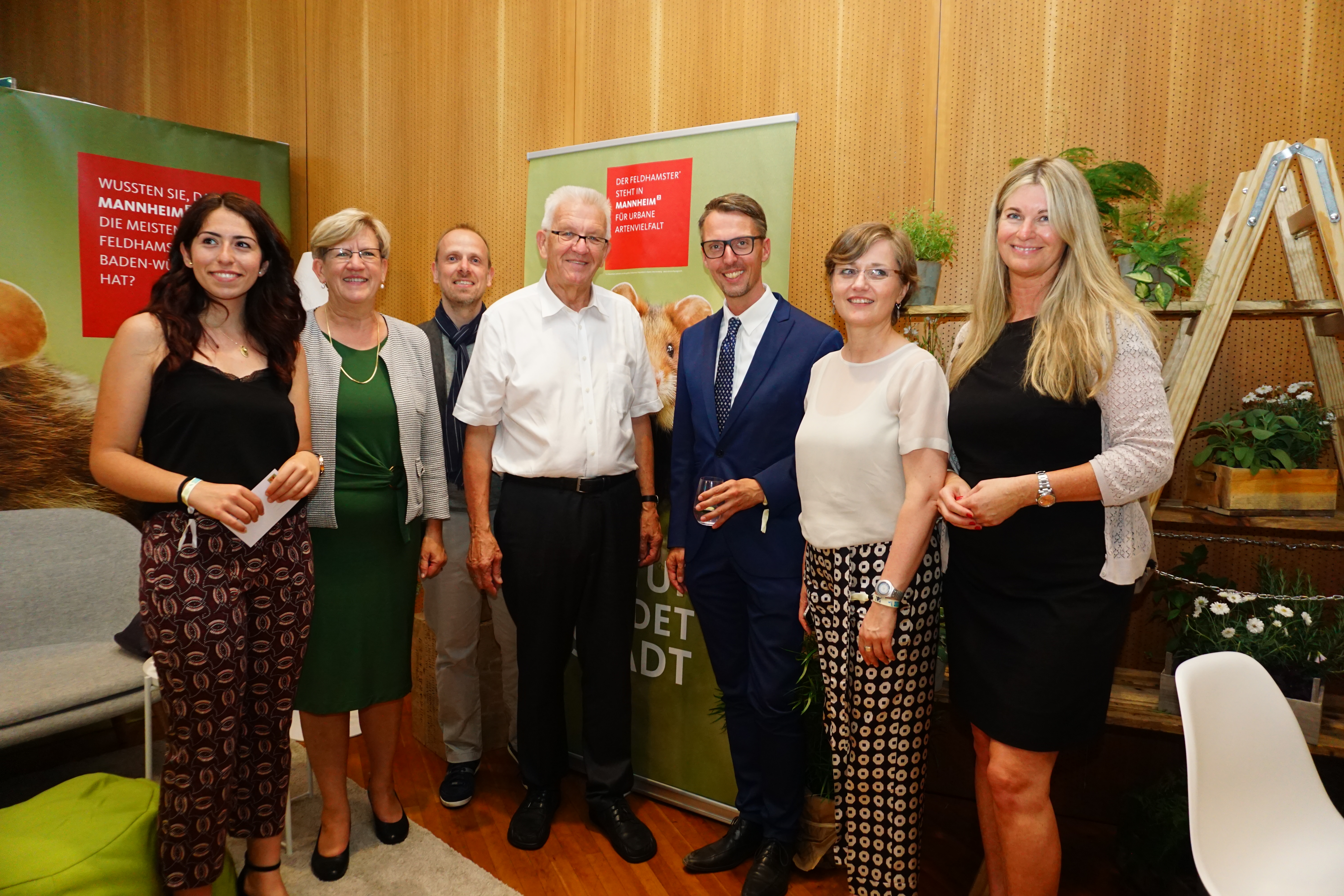 Ministerpräsident Winfried Kretschmann am Mannheim Stand mit Melis Sekmen, Bürgermeisterin Felicitas Kubala, Dirk Grunert, MdB Lars Castellucci , Karmen Strahonja und Andrea Anslinger.