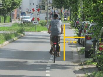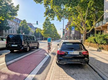 Für ein sicheres Radfahren sollte mindestens ein Meter Abstand zwischen parkenden Autos und Rad gehalten werden. Das Bild zeigt symbolisch die Rheingoldstraße. Dort wurde der Schutzstreifen mittlerweile entfernt.