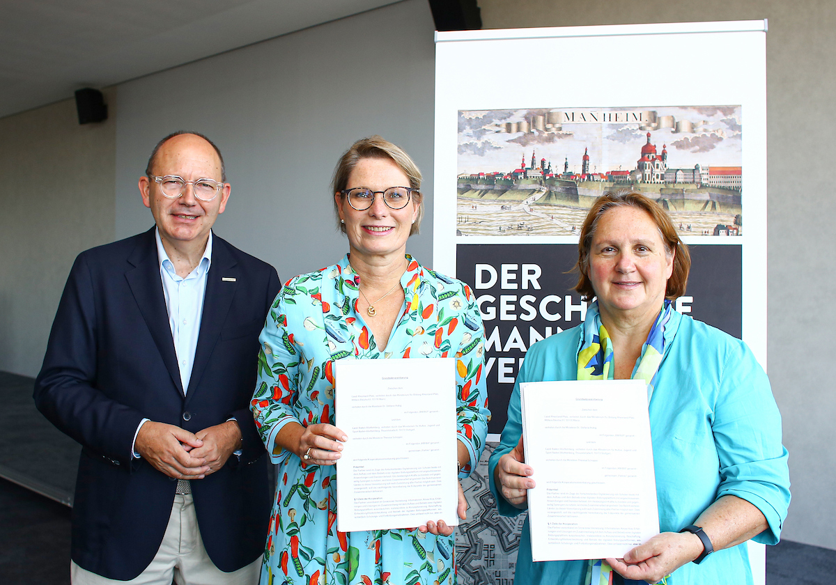 Unser Bild zeigt die Bildungsministerin in Rheinland-Pfalz, Dr. Stefanie Hubig und Baden-Württembergs Kultusministerin Theresa Schopper, mit Oberbürgermeister Christian Specht nach der Vertragsunterzeichnung