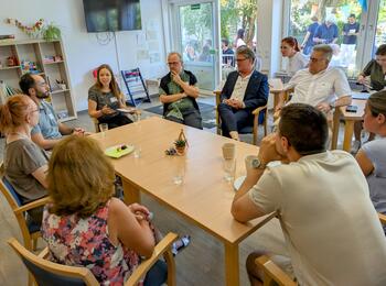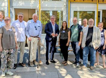Thorsten Riehle, Bürgermeister und Verwaltungsratsvorsitzender des städtischen Leihamts, und Anton Meinzer, neuer Leiter des Leihamts, auf der Treppe der Empfangshalle des Leihamts.