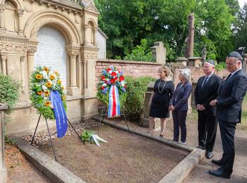 Erste Bürgermeisterin Prof. Dr. Diana Pretzell, der Präsident der IHK Rhein-Neckar, Manfred Schnabel, die Vorsitzende der Jüdischen Gemeinde, Prof. Dr. Heidrun Deborah Kämper und IHK-Hauptgeschäftsführer Dr. Axel Nitschke gedenken Richard Lenel an seinem Ehrengrab.