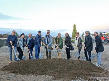 Mit dem symbolischen Spatenstich durch das Architekturbüro, den Stadträtinnen, dem Fachbereich Tageseinrichtungen für Kinder sowie Bürgermeister Ralf Eisenhauer (5.v.l.) und Bürgermeister Dirk Grunert (6.v.l.) begann die Bautätigkeit für den Kindergarten am Werner-Nagel-Ring.