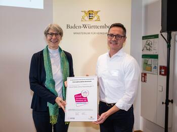 Staatssekretärin Elke Zimmer überreichte die Auszeichnung "fahrradfreundliche Kommune" in Bronze an Bürgermeister Ralf Eisenhauer.