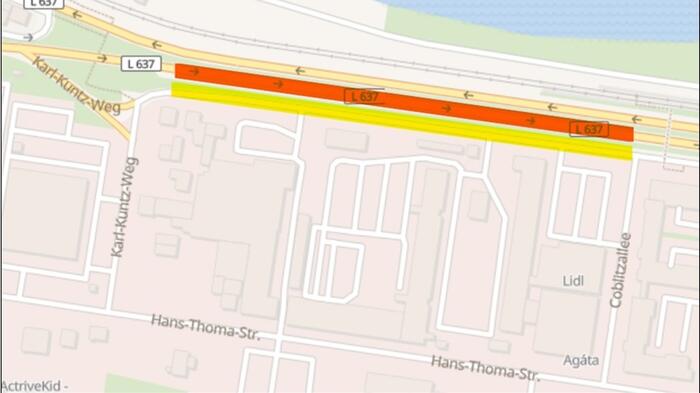 rot = Der Bring- und Holbereich für Besucher befindet sich am Parkstreifen der Hauptfahrbahn der Seckenheimer Landstraße Fahrtrichtung Seckenheim im Bereich zw. Karl-Kuntz-Weg und Coblitzallee.