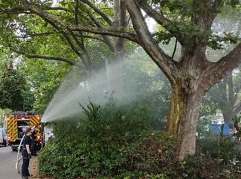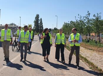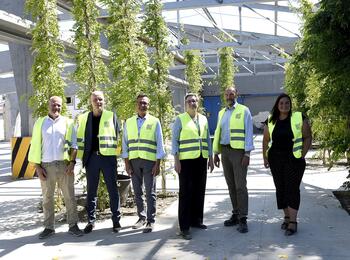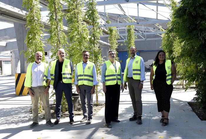 Informierten sich über den Fortschritt auf dem BUGA-Gelände (von link): Klaus-Jürgen Ammer (Beauftragter Konversion & Leiter Projektgruppe Konversion bei der Stadt Mannheim), Achim Judt (Geschäftsführer MWSP), Ralf Eisenhauer (Baubürgermeister Stadt Mannheim), Klara Geywitz (Bundesministerin für Wohnen, Stadtentwicklung und Bauwesen), Michael Schnellbach (Geschäftsführer BUGA 23 gGmbh) und Isabel Cardematori (MdB).