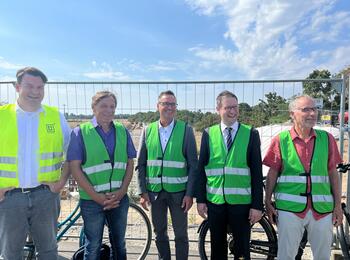 Freuten sich gemeinsam über den Fortschritt im Projekt Radschnellweg Mannheim-Viernheim-Weinheim: Dr. Christian Lerch, Leiter Parkanlage und Infrastruktur der Bundesgartenschau Mannheim 2023 gGmbH (links), Mannheims Baubürgermeister Ralf Eisenhauer (Mitte) und Weinheims Oberbürgermeister Manuel Just (2.v.r.).