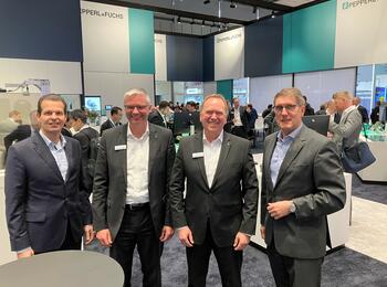 Dr. Elmar Bourdon (Key Account Wirtschaftsförderung), Reiner Müller und Lutz Liebers (beide Pepperl + Fuchs), Wirtschaftsbürgermeister Michael Grötsch