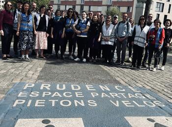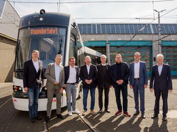 v.l.n.r.: Frank Ehemann, Bereichsleiter Fahrzeuge und Projektleiter RNT 2020 bei der rnv, Martin in der Beek, Technischer Geschäftsführer der rnv, Raoul Schmidt-Lamontain, Bürgermeister für Klimaschutz, Umwelt und Mobilität der Stadt Heidelberg, Christian Specht, Erster Bürgermeister und ÖPNV-Dezernent der Stadt Mannheim, Alexander Thewalt, Bau- und Umweltdezernent der Stadt Ludwigshafen, Christian Schreider, Mitglied des Deutschen Bundestages, Christian Volz, Kaufmännischer Geschäftsführer der rnv und Dr. Kay Biebler, Senior Project Director bei Skoda Group, bei einer RNT-Pressefahrt am Mittwoch, 3. Mai.