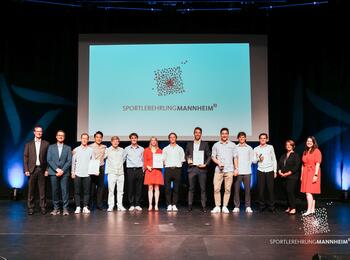 Die Geehrten, Sportlerin des Jahres 2022 Jessica-Bianca Wessoly, Sportler des Jahres 2022 Nick Trinemeier und die erste Herrenmannschaft Mannheimer Hockeyclub 1907 e.V mit Sportbürgermeister Ralf Eisenhauer.