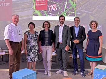 Wolfgang Guckert, Vorsitzender des Kreisbauernverbandes Rhein-Neckar e.V., Nicole Gross, Leiterin des Amtes für Landwirtschaft und Naturschutz Rhein-Neckar-Kreis, Dr. Sabine Mahr, Leiterin der Unteren Naturschutzbehörde der Stadt Mannheim, Michael Eick, Leiter der Akademie für Natur- und Umweltschutz des Ministeriums für Umwelt, Klima und Energiewirtschaft, Dr. Andre Baumann, Staatssekretär des Ministeriums für Umwelt, Klima und Energiewirtschaft und Bürgermeisterin Prof. Dr. Diana Pretzell.